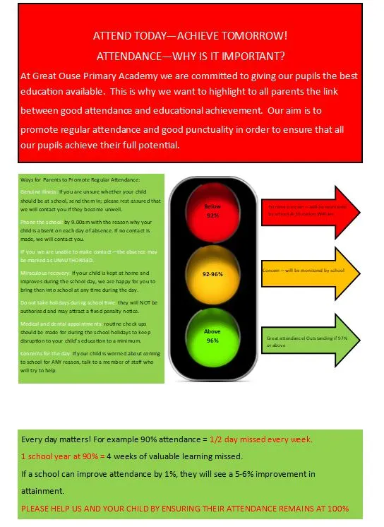 At Great Ouse Primary Academy, we believe that regular attendance at school is one of the keys to pupils gaining the greatest benefit from their education. It is also an important part of their preparation for the world of work. Our pupils should arrive on time and be in school unless absence is unavoidable and we know that the support of their families and carers is important to achieve this.