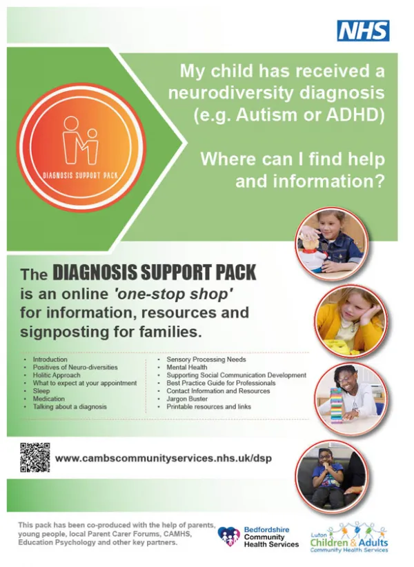 The Diagnosis Support Pack (DSP) has been coproduced by families for families following a diagnosis of a neurodiversity, and contains information, resources and signposting in a variety of media (video's, infographics, animations), split into 14 sections - from sleep to medication, and lots more.